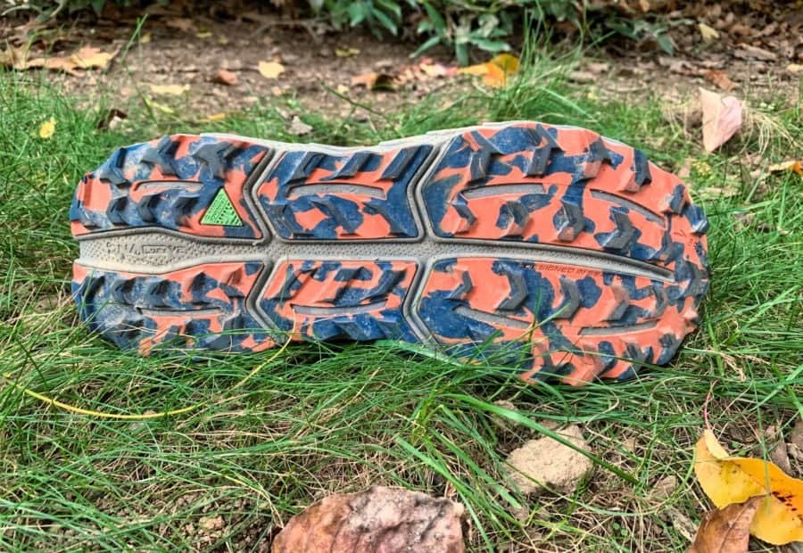 زیرهی بیرونی: ترکیب TrailTack Green (لاستیک با درصدی مواد بازیافتی) چسبندگی بالایی روی سنگ خیس، ریشهها و خاک فشرده فراهم میکند. عمق «لاگها» حدود ۳.۹ میلیمتر است—چیزی بین چنگاندازی تهاجمی و دویدن روان. طرح آجها سهگانه است: در پاشنه نفوذیتر برای گاز گرفتن، در میدفوت سادهتر برای جلوگیری از کیکگِل، و در فورفوت «گُوِهای» برای چابکی در پیچها. سختی لاستیک کمی نرمتر از میانگین کلاس اندازهگیری شده تا «Grip» بهتر شود؛ با این حال در تست سایش هم عملکرد خوبی ثبت کرده است (فرورفتگی کم در آزمون درمل).